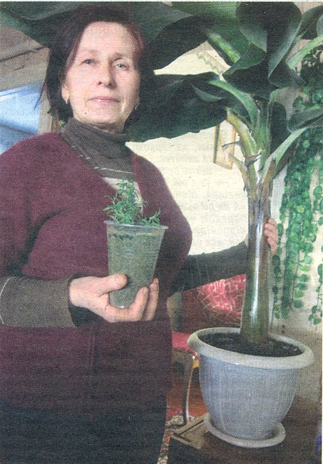 55-річна Галина Кириченко з Великого Щимеля Щорського району вирощує два роки вдома декоративні банани, руколу, орегано, базилік, цибулю-порей, розмарин, кінзу, брюссельську капусту.
