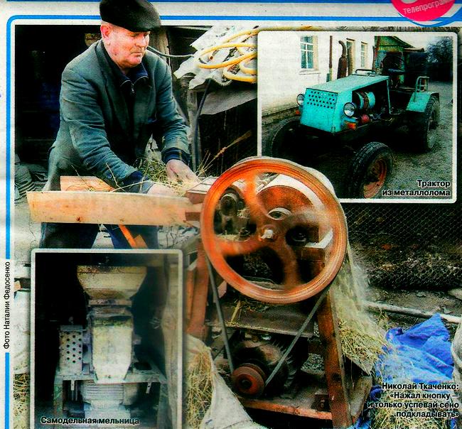 — Я просто люблю, чтобы в хозяйстве порядок был, — говорит Николай Яковлевич. - По специальности я шофер, всю жизнь проработал в местном колхозе: и трактористом был, и водителем, и пасечником. Хоть столярничал еще мой отец, но этому я научился сам — отца не стало, когда мне исполнилось 7 лет. Считаю, что научиться всему можно, было бы желание. Мне всегда нравилось придумывать разные устройства, ремонтировать технику. Лет 20 назад из металлолома и тракторных деталей я смастерил электрическую мельницу. Это была первая такая мельница на все село. К ней я пристроил специальные решетки с отверстиями разного размера, чтобы можно было молоть зерно не только на муку, но и на крупу и фураж. Через час она перемалывает примерно 15 мешков любого зерна: пшеницы, ржи, кукурузы. Многие односельчане и себе сделали такие мельницы — я их научил. А кое-кто до сих пор приходит молоть зерно только ко мне. Еще я сам сделал трактор. У меня был лишь мотор от него, все остальное — металлолом. Для кого-то это мусор, а я полезную вещь сделал! Лет 5 назад«склепал» еще и корморезку - она измельчает сено или солому. Раньше приходилось это делать вручную, а теперь нажал кнопку — и только успевай сено подкладывать. Такая корморезка в хозяйстве — хорошая помощь: быстренько порезал сено и добавил его в мешку скоту. Хозяйства большого не держим — три козы, две свиньи, куры. Живем вчетвером: мы с женой, моя сестра (они с женой инвалиды второй группы), а также 90-летняя теща. Поэтому все заботы по хозяйству в основном на мне. У нас с женой есть три взрослых дочери, но они живут отдельно, у каждой своя семья.