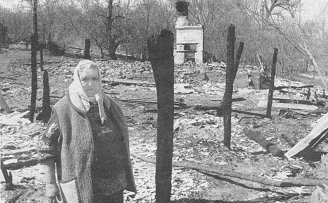 Проходимо мимо згорілих дворів. Де були хати, позалишалися тільки розвалені печі. Наче вибухом, повиривало двері погребів. Досі тхне гаром. Обгорілі до вугілля стовпи сараїв, розтріскані горщики. Високо на пригорілому дереві — гніздо з лелеками.