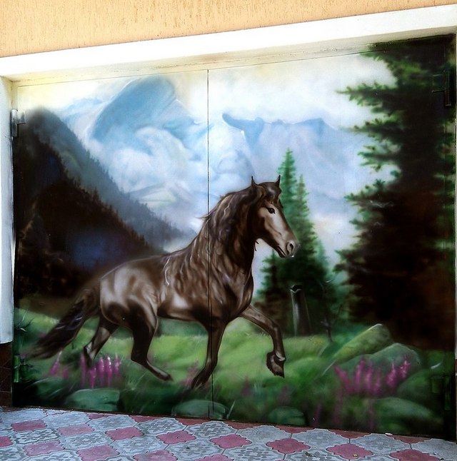 Это был заказ в поселке Ивановка. Там был частный дом, обнесенный по периметру огромным шиферным забором. И мне нужно было зарисовать весь этот забор пейзажами и видами природы. Там было около 130 м2.