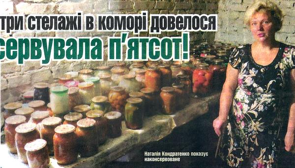 — Ось наші запаси, — перебирає банки Наталя. — Троє дітей, двоє з них студенти. Треба годувати. Салат «Тещин язик» хлопці люблять. Він з кабачків та баклажанів. Огірочки по-польськи (солодкі) і в кетчупі «Чилі». Такі найбільше смакують сину Колі. Сік томатний — для Владислава, він один його любить. Банок додатково не купувала. Дістала з погреба стару консервацію. Перебрала, що викинуть, а що ще можна лишити. Банки звільнила, кришки купила. Ними закручую один раз. Користуюся і єврокришками, що закручуються вручну, а не ключем.