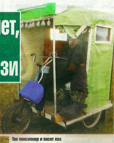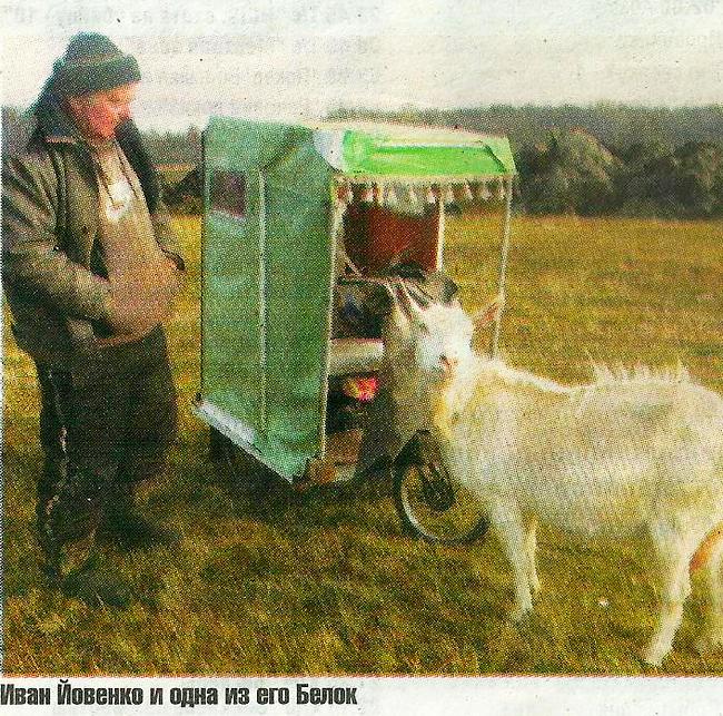 65-летний черниговец Иван Иовенко в районе Бобровицы в Чернигове пасет коз на лугу, сидя в будке на колесах. Пока три Белки едят траву, мужчина слушает радио. Зеленая «будка» из брезента. По бокам окошки, обрамленные пластмассой. Сиденье — как в машине. Руль от велосипеда. Сбоку, возле переднего колеса, цепь. Над крышей белые помпоны от штор. Дома у мужчины стоит летний вариант для выезда на луг и два велосипеда, подсоединенные к китайским аккумуляторам.