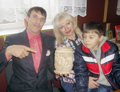 Антон, Аня і Єгор під час конкурсу родин, який проводився у районній бібліотеці