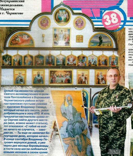 Целый год иконостас церкви Святого великомученика и целителя Пантелеймона в Боромыках Черниговского района встречал прихожан пустыми рамами — художник Владимир Синица, который начал его писать, ушел добровольцем в зону АТО. И хоть предлагал настоятелю храма отцу Сергию найти другого мастера (мол, всякое может статься), тот отказался: «С тобой на войне ничего не случится, — заверил он. — Ты еще не закончил богоугодное дело, которое начал». В конце сентября Владимир Петрович вернулся домой, а уже через два месяца боромыковцы и гости села могли любоваться новыми иконами в своем храме.