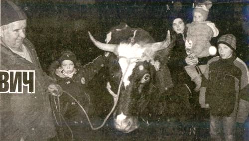 Микола Орехович з онуками: Ярославом, Сніжаною, Кариною (на руках у Сніжани) та Артемом. У центрі - корова Веселушка