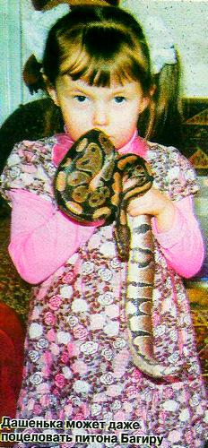 - Это у нас Багира. Не бойтесь, она сытая - недавно съела хомячка. Это на стадии охоты питонов не стоит трогать. К тому же у нее сейчас спячка, поэтому она не очень активна. Да и вообще, Багира чрезвычайно спокойная, даже работала фотомоделью с детьми. Она настолько миролюбива, что когда мы запустили к ней мышку, Багира стала с ней... играть.
