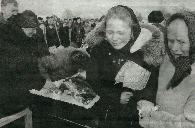 Біля труни, заціпеніла, у чорній хустині стоїть Юля Корсун. Це дівчина героя. Сама киянка. У Краснопілля приїздила до дідуся з бабусею. Тут і познайомилась з Геною. Років три як зустрічалися.