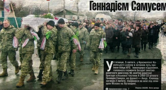 У п’ятницю, 5 лютого, у Краснопіллі Коропського району в останню путь провели бійця АТО, командира відділення, головного сержанта батареї зенітно-ракетного дивізіону 96 зенітно-ракетної бригади військової частини А-2860 22-річного Геннадія Самуся, на фронті – Амур. Хлопець загинув 2 лютого, підірвався на міні під селищем Мілове на Луганщині.