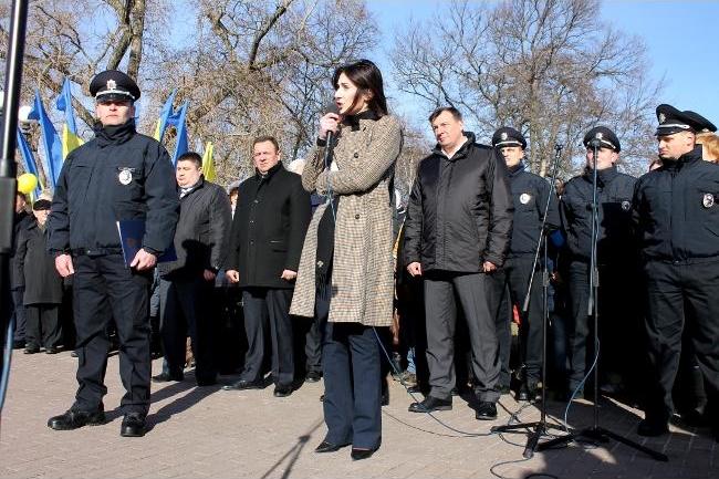 Поздравить наших полисменов приехала и первый заместитель министра внутренних дел Украины Эка Згуладзе. На ее выступление повлияли недавние печально известные события со стрельбой в Киеве, которые вызвали немалый резонанс (в ночь на 7 февраля четверо правонарушителей на иномарке убегали от полицейских, не реагируя на их требование остановиться. В конечном итоге правоохранители открыли огонь по автомобилю и смертельно ранили 17-летнего пассажира).
