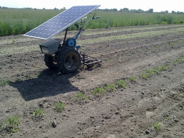 — Изобретательство у меня в крови, - объясняет фермер. - Отец работал на ЧеЗаРе, совершенствовал оборудование, станки. Имеет много патентов на изобретения. Думаю, его умение передалось и мне. Я очень люблю мастерить разные приборы, делать чертежи... В прошлом году сделал специальное устройство, которым можно и полоть, и сеять. Еще и урожай перевозить, и самому ездить. Сделал его из старого мотоблока, электродвигателя на 1 кВт (приблизительно 1 лошадиная сила) и солнечной батареи. Он очень простой в использовании: кнопку нажал - и работаешь. Не воняет, не шумит. Одним словом — очень удобно. Солнечную батарею я купил за 6 тысяч гривен, но она за год работы окупается. Я посчитал, что обычный мотоблок через час работы сжигает 2 литра бензина. Выходит, за 10 дней тратится примерно 1600 гривен только на горючее. А мое устройство не нуждается в горючем, потому что питается энергией солнца. Причем батарея будет служить около 30 лет. Использовать ее можно не только в поле. Цепляешь к дому, чтобы производила электричество от солнечных лучей, и можно телефоны заряжать.