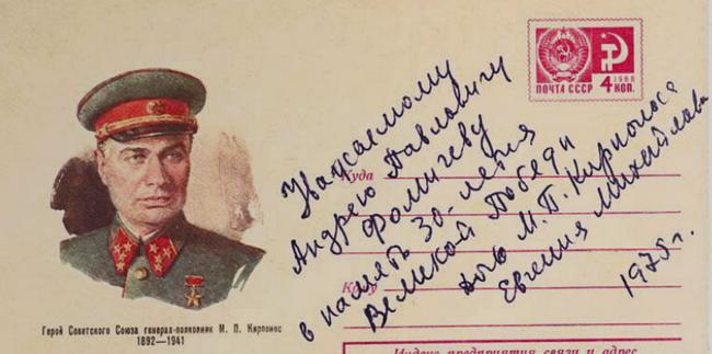 В теплой дружеской беседе мы и не заметили, как в окнах соседних домов начали зажигаться огни - засиделись! Прощаясь, Евгения Михайловна вынула из сумочки юбилейный почтовый конверт, посвященный ее отцу, и оставила на нем приятную мне запись (на снимке).