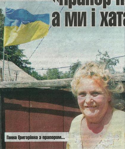 — Ми за Україну! Це вже другий прапор, — хвалиться 68-річна господиня Ганна Заїка. — Перший повісили ще два роки тому, як тільки повз двір пройшли танки. Перший нам пошила племінниця, бо своїх дітей не маємо. З часом прапор вітром розірвало, на сонці вигорів. У всіх знайомих просили новий. А це копирсалася в городі, коли чую, собака наш гавкає. Я до паркану — а вже новий прапор висить. Не знати від кого.