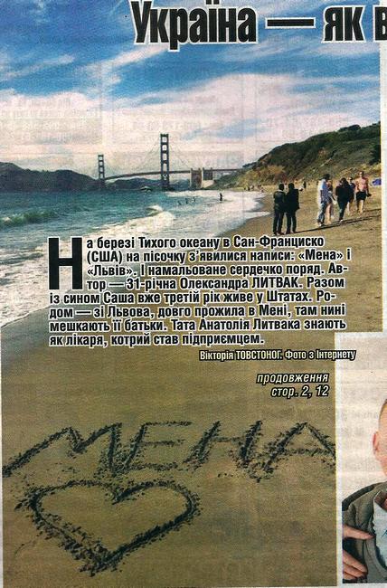 На березі Тихого океану в Сан-Франциско (США) на пісочку з’явилися написи: «Мена» і «Львів». І намальоване сердечко поряд. Автор – 31-річна Олександра Литвак. Разом із сином Саша вже третій рік живе у Штатах. Родом – зі Львова, довго прожила в Мені, там нині мешкають її батьки. Тата Анатолія Литвака знають як лікаря, котрий став підприємцем.