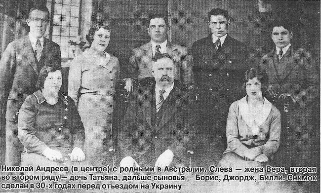 В Австралии — в Сиднее — он прожил больше 25 лет. Здесь и женился. У его жены — моей бабушки Веры — были украинские корни. Она родила деду четверых детей. Старших назвали «по-нашему» - Борис и Таня. У них уже были семьи, когда дед затосковал по родине. Так сильно, что захотел вернуться. Это было в 30-х годах. Оставив богатую Австралию, они (дед, бабушка и два их младших сына — Джордж и Билли) приехали в голодную и растерзанную Украину - на Черниговщину.