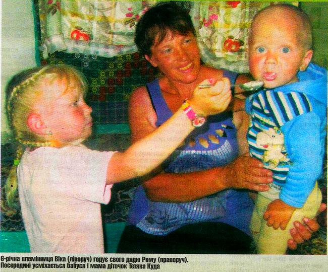 Я його племінничка, — 6-річна Вікуся з Харитонівки Срібнянського району показує на усміхненого Ромчика, якому трохи більше рочку. Дівчинка турботливо годує кашкою малюка. Він щойно прокинувся. За картиною з усмішкою спостерігає 45-річна Тетяна Куда. Вона і мама, і бабуся. Найстаршій доньці Аллі — 27 років, Яні — 25, Юрі — 17, Сашко закінчив 9 класів, Сергій — п’ять, йому 11, Віталику — десять. А Ромчик — наймолодший серед сімох діточок Кудів. Він з’явився на світ, коли Тетяні було 44, її чоловіку Віктору — 56. іх старшій онуці Вікусі вже 6. Дівчинка із задоволенням бавить на п’ять років молодшого дядька Рому.