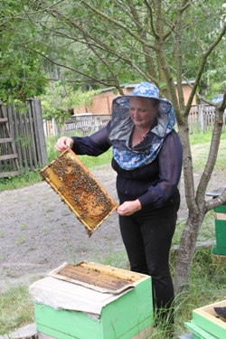 «Я дуже люблю бджіл, – каже жінка. – Колись починала з однієї бджолиної сім’ї, тепер їх у мене аж десять. Я сама зі своїми бджолами клопочуся, а чоловік із сином мед качати допомагають».