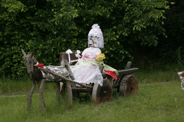 «Почала робити дерев’яні скульптури, аби принести хоча б дещицю прекрасного в життя людей, – розповідає про свою мотивацію Людмила Шульга. – Знаєте, мені це вдалося! Приємно спостерігати, як зупиняються подорожні і фотографуються біля моїх фігур. А деякі вироби стали настільки популярними, що «переїхали жити» в іншу місцевість. Я бачила віз із дерев’яними чоловіками у Шостці біля одного з місцевих кафе, – продовжує жінка. – Оця молода на коні минулого року була вдягнена в білоруський національний костюм. Її вдягнула не я, а хтось із людей, які проїжджали повз».