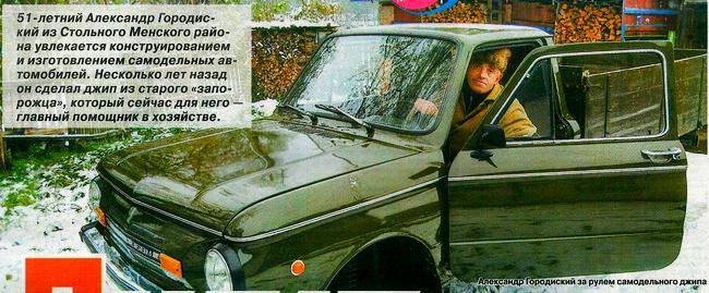 51-летний Александр Городиский из Стольного Менского района увлекается конструированием и изготовлением самодельных автомобилей. Несколько лет назад он сделал джип из старого «запорожца», который сейчас для него - главный помощник в хозяйстве.