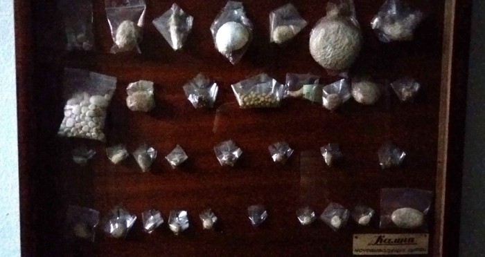 Самый большой камень диаметром 5 см находится в верхнем ряду, 2-й справа. Во втором ряду, 1-й слева - мешочек с камнями, удаленными из мочевого пузыря у одного человека.