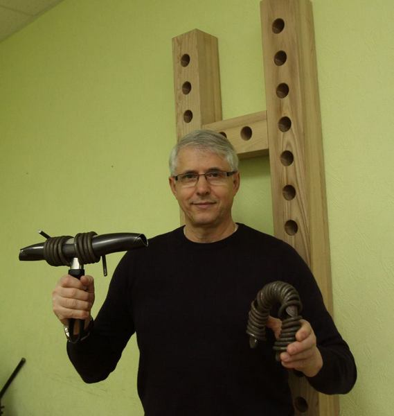 Тренажер виглядає, на перший погляд, просто. Це два великі дерев’яні бруси, з’єднані між собою та прикріплені до стіни. У брусах просвердлено паралельні круглі отвори, у них вставлено палиці. Стискаєш їх на різному рівні обома руками – і розумієш, що напружуються м’язи й сухожилля – на руках, на спині, на попереку і навіть на ногах. Дивовижне відчуття... Здається, працює все – з голови до п’ят.