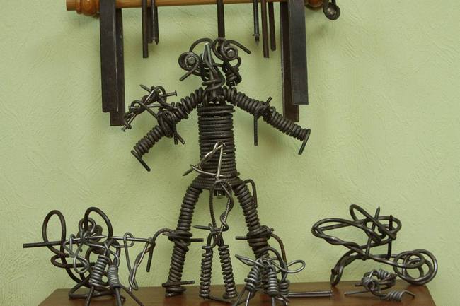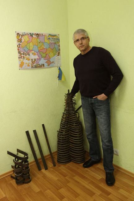 – Понад 100 кілограмів. І арматуру, і сковорідки. Ось робот із арматури. Гарна скульптурка? І коли зав’язуєш такий метал, усе тіло працює. Отож це не просто сила в руках. Коли у молодого хлопця-спортсмена «випадає коліно» – на це тяжко дивитися. І два з половиною місяці тренувань на тренажері не минули марно. Уже 3 роки все гаразд. За рахунок тренувань сухожиль. Вони стають міцними й добре помітними. Коли ти вже натренований, можна робити перерву.