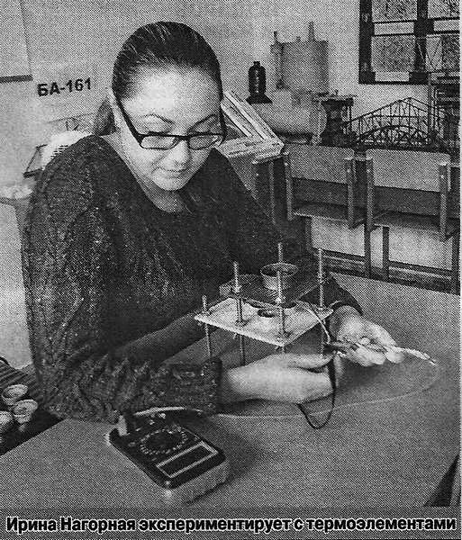 — Исследую сварку термоэлементов, принцип действия которых базируется на эффекте Пельтье (явлении выделения или поглощения тепла на контактах двух проводников при прохождении через них электрического тока. Ант.), объясняет она.