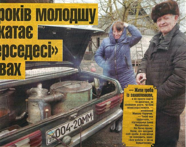79-річний Микола Наумчик встановив у свій «Mercedes Benz» газогенераторну установку. Зробив її власноруч. Тепер автомобіль їздить на дровах. Разом з дружиною 59-річною Іриною Остапенко все літо їздили на пасіку на «дров’яному» Мерседесі.