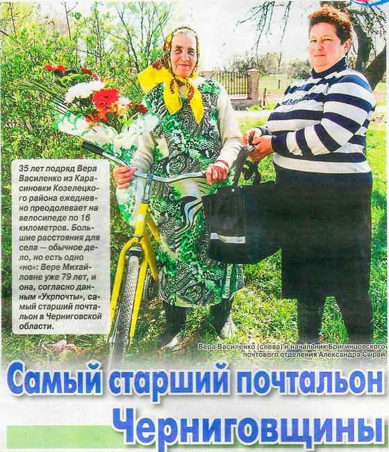 35 лет подряд Вера Василенко из Карасиновки Козелецкого района ежедневно преодолевает на велосипеде по 16 километров. Большие расстояния для села — обычное дело, но есть одно «но»: Вере Михайловне уже 79 лет, и она, согласно данным «Укрпочты», самый старший почтальон в Черниговской области.