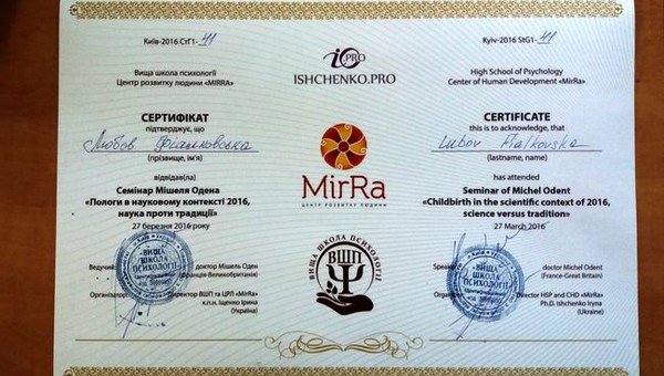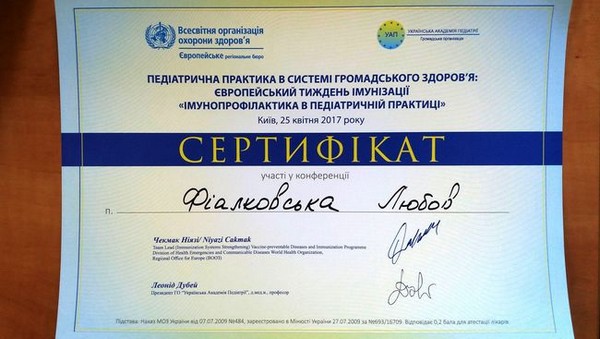 Также, о постоянном развитии в своей сфере деятельности свидетельствуют сертификаты, врученные Любови Фиалковской. Например, о прохождении в Киеве семинара французского доктора Мишеля Одена «Пологи в науковому контексті 2016, наука проти традиції»; об участии в конференции «Імунопрофілактика в педіатричній практиці» в Киеве в апреле этого года и много др.
