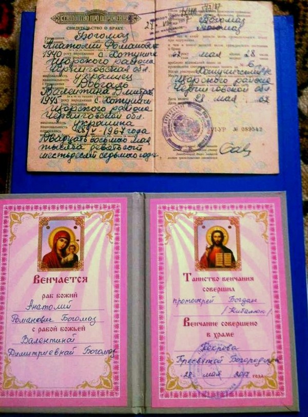 А под конец праздника дети предложили родителям закрепить их и так уже проверенный временем, крепкий союз, обрядом венчания. И на следующий день, 28 мая, ровно через 50 лет, раб божий Анатолий Романович Богомаз повенчался с рабой божьей Валентиной Дмитриевной Богомаз.