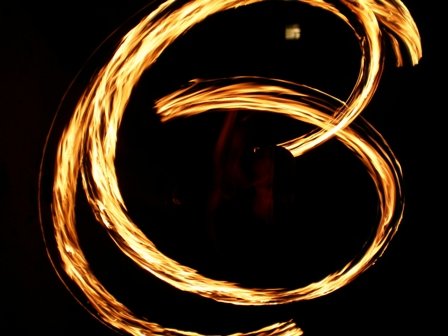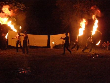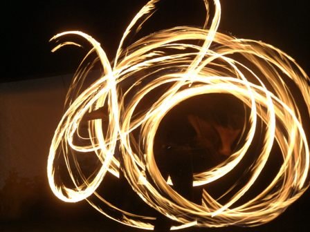 Для тренировок мы используем обычные длинные носки, набитые теннисными шариками или крупой. Для выступлений: пои – это фитили на цепях (разной длины), огненные веера, «хендзы» или как он еще называется «огненное прикосновение» – создают эффект пылающих ладоней, палки с двумя фитилями, фаер-болы – выдувание пламени из рта, пиротехнику (мы обычно используем «вулканы»). Ну а если представление массовое, то там все уже зависит от обстоятельств.