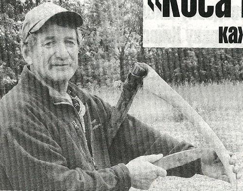 — Жодної. П’ятка доволі разів відривалась. (П’ятка — частина коси, якою вона тримається за держак. — Авт.). Там, де вона заходить у кастє, слабке місце. (Кастє — довга палиця, на яку кріпиться металева частина коси). Оце все в кузні робилося. У кастє вставляється п’ятка, зверху надівається залізний обруч, і ще я забиваю дерев'яний клинок, щоб міцніше трималося.