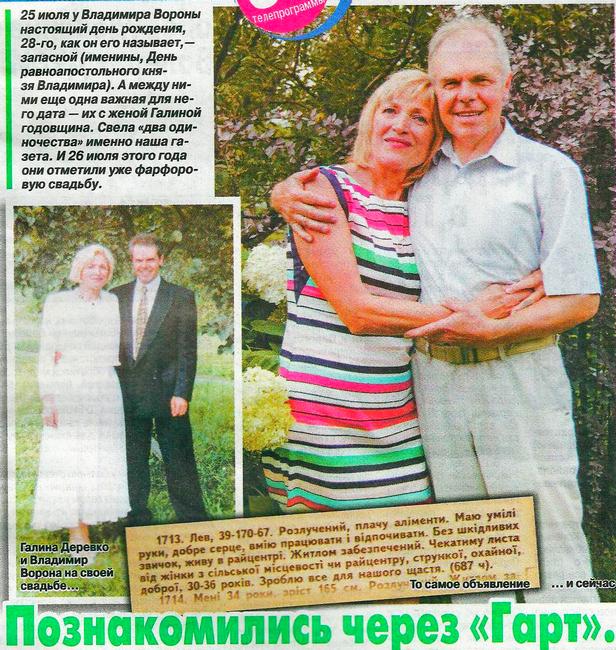 25 июля у Владимира Вороны настоящий день рождения, 28-го, как он его называет,— запасной (именины, День равноапостольного князя Владимира). А между ними еще одна важная для него дата — их с женой Галиной годовщина. Свела «два одиночества» именно наша газета. И 26 июля этого года они отметили уже фарфоровую свадьбу.
