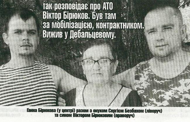 69-річна Ганна Бірюкова із села Богдани Варвинського району півроку як діждалася з війни сина, 42-річного Віктора. Та ще півтора року лишилося чекати онука, 25-річного Сергія Безбаха. Він морпіх. Та воду, жартує, бачить рідко. Працюють як розвідувальна рота. Служить в районі Водяного, Опитного на Донеччині.