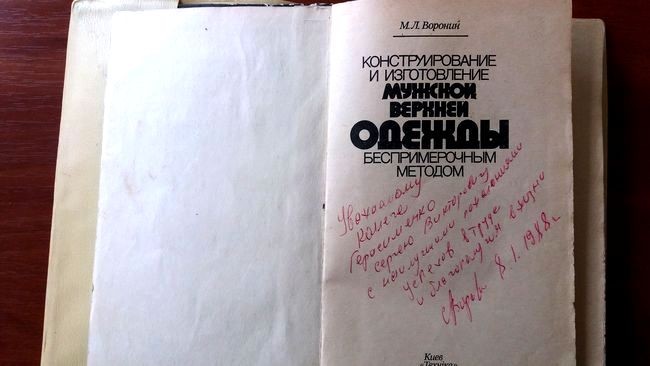 Когда я учился мастерству у Михаила Воронина, он мне подарил свою книгу «Конструирование и изготовление мужской верхней одежды беспримерочным методом» с дарственной надписью, которую я бережно храню до сих пор. С той памятной даты прошло уже 29 лет!
