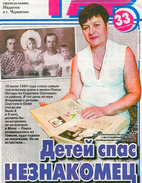 16 июля 1994 года стало самым трагическим днем в жизни Раисы Негоды из Кудровки Сосницкого района. В тот день ее муж Владимир с детьми, Сергеем и Олей (тогда им было 8 и 6 лет), должны были встретить ее на вокзале в Мене — Раиса возвращалась из Гомеля, куда ездила за покупками. Но не встретили...