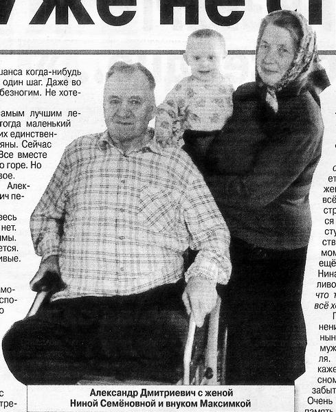 — Как будто даже помолодел от этого (Александру Дмитриевичу — 65. — Авт.), — радуется Нина Семёновна. Несколько раз в неделю она возит мужа (на коляске) заниматься лечебной физкультурой, на массаж или просто побыть среди людей.