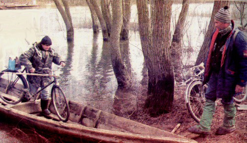 У четвер, 26 березня, біля річки було холодно і безлюдно. Поверхня води рябить від пронизливого вітру, баркаса ніде не видно. Хвилин через двадцять на протилежному березі крізь зарості пробираються двоє колоритних чоловіків, прямують до невеликого будинку. Звідти виходить третій, спускаються до річки. Ага, он і човен, відчалив від протилежного берега. Двоє гребуть веслами, третій сидить посередині, тримає велосипед. Великий дерев'яний човен пристав неподалік переправи.