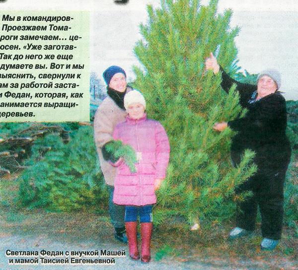 Одна из пятниц ноября. Мы в командировке в Ичнянском районе. Проезжаем Томашовку и в стороне от дороги замечаем... целые ряды срубленных сосен. «Уже заготавливают к Новому году? Так до него же еще больше месяца...» — подумаете вы. Вот и мы удивились. Чтобы все выяснить, свернули к домику на обочине. И там за работой застали женскую часть семьи Федан, которая, как оказалось, уже 16 лет занимается выращиванием вечнозеленых деревьев.