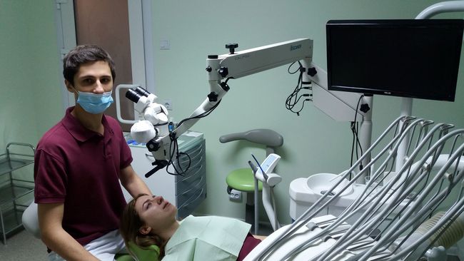 Андрей Викторович Ковалев работает с микроскопом, который необходим для эндолечения (лечение системы каналов зубов). Это совершенно новое направление в Чернигове.