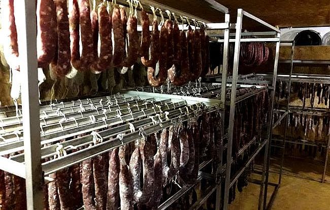 Из 50 кг свиного мяса мы получаем на выходе 25 кг сыровяленой колбасы. Как правило, 17 готовых колбасных изделий весят 3 кг, то есть, из 50 кг мяса мы производим ориентировочно 140 изделий.
