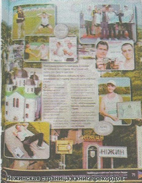 В этом городе вообще очень много рекордсменов. Нежинский студент Константин Мухомодеев за последние два года установил два рекорда: 3020 приседаний с заложенными за голову руками и 4248 сгибаний пресса (и то, и другое — за час). Воспитанница школы искусств при Нежинском училище культуры и искусств им. М. Занько-вецкой, 12-летняя Анастасия Майорова, создала наибольшее количество пейзажей на тыквенных семечках —106. Ее подруга по школе искусств Каролина Пархоменко со своим наименьшим трезубцем из соленого теста попадет уже в следующее издание книги.