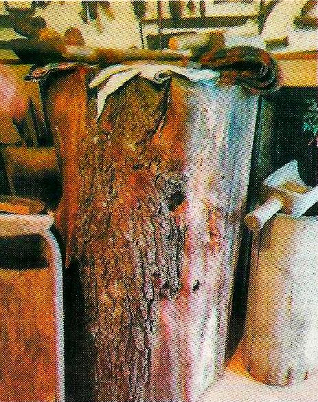 Оця широка бочка - старовинна медокач-ка! Уявіть, вона повністю зроблена з дерева! Скільки їй років? Також дві сотні, як тому дубові. Стінки тоненькі, міцна вірьовка на вал накручена. Якщо потягнеш з силою - медо-качка закрутиться.