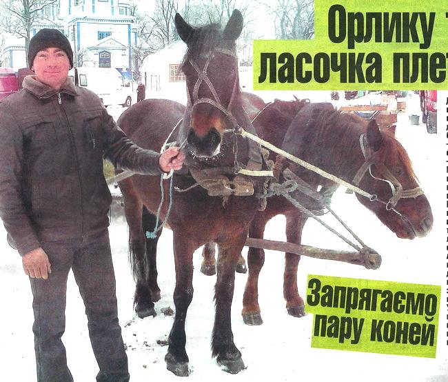 — Ану, тримайтеся за штиря і суньтеся трохи назад, покручу! — раптом пропонує 27-річнии Віталій Морфлюк. Розвертає, пришпорює — і коні починають крутити сани по п’ятачку на роздоріжжі двох вулиць. Крутіше, ніж на машині. Мимо пролітають хати, кучугури снігу край дороги. «Хоч приземлятися м’яко буде», — мелькнуло в голові. Репетувала, та на санях утрималася.
