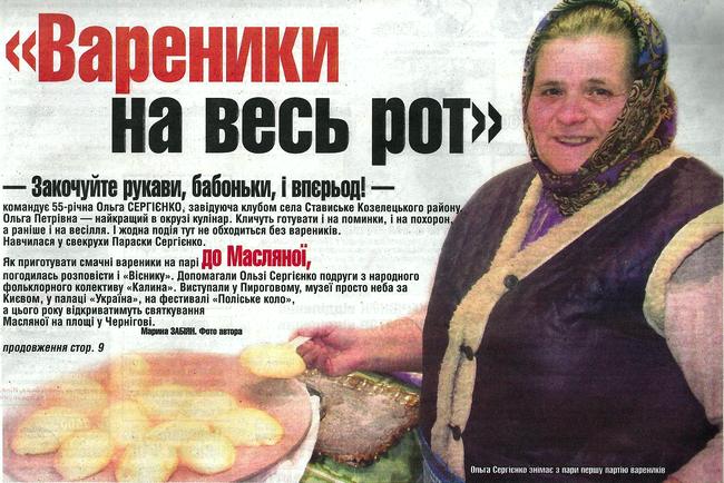 Як приготувати смачні вареники на парі до Масляної, погодилась розповісти і «Віснику». Допомагали Ользі Сергієнко подруги з народного фольклорного колективу «Калина». Виступали у Пироговому, музеї просто неба за Києвом, у палаці «Україна», на фестивалі «Поліське коло», а цього року відкриватимуть святкування Масляної на площі у Чернігові.