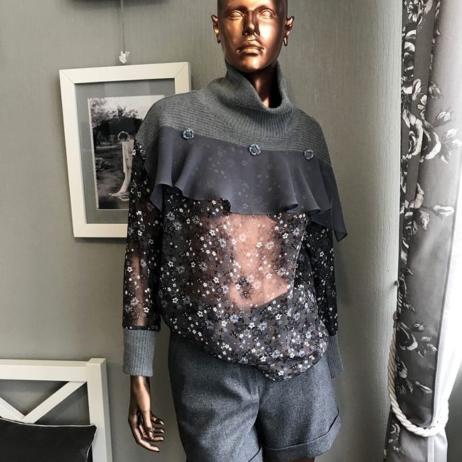 Одним из моих любимых изделий стала нежная прозрачная в цветочек блуза с шифоновой пелериной, украшенной кокетливыми цветочками, дополненная трикотажной горловиной и манжетами.