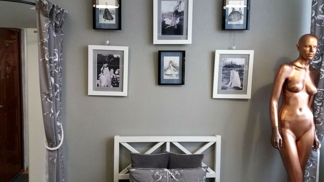 Действительно, как говорится, «театр начинается с вешалки», так и мастерская Лены начинается с примерочной, манекена и вешалки, а затем не замечаешь, как начинаешь наполняться женской энергетикой, теплом, красотой и утонченностью, чем-то приятно-невидимым, летающим в воздухе. На стене и подоконнике – черно-белые фотографии в рамках с изображением Лены, и эскизы, сделанные ею. Рисование – это еще одно из умений и увлечений этой девушки.
