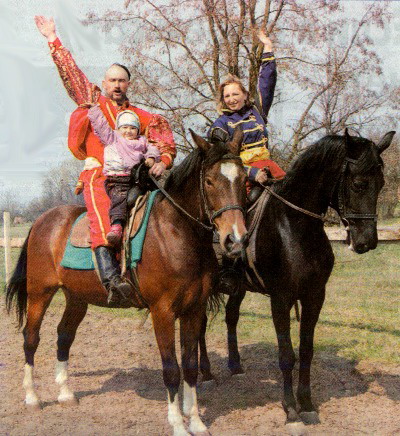 Ярослава всегда рядом с Евгением. И тоже на лошади. Да и их доченька Саша, которой почти три годика, буквально выросла на конном заводе, так что в седле держится уверенно. Знает клички каждой лошади. Кстати, два гривастых красавца с этого завода тоже снимались в «Тарасе Бульбе» — это скакуны Скальд (он отработал всю картину!) и Мустанг.