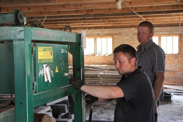 Верстатник Геннадій Глянець і його помічник Олександр Воробей роботою задоволені. Хоч і не з легких вона. Щодня чоловікам доводиться тягати та розпилювати важкі колоди.