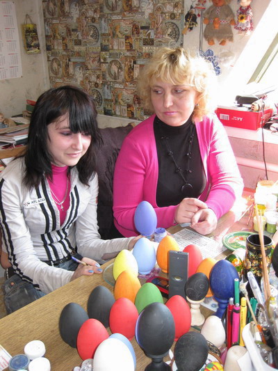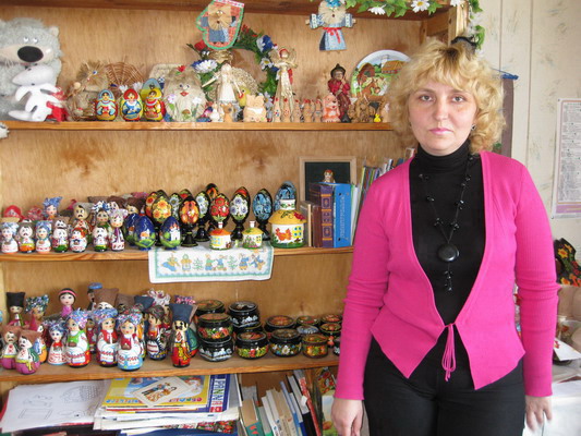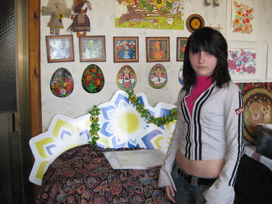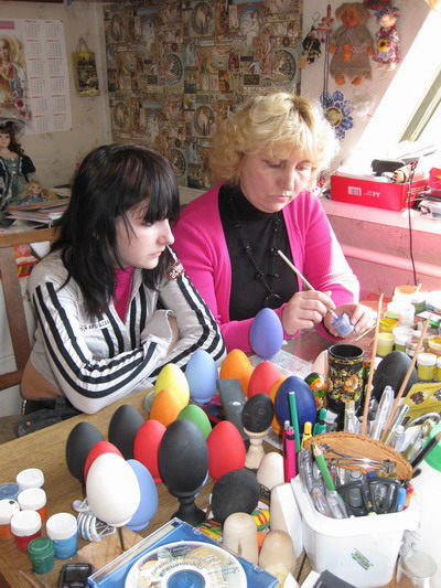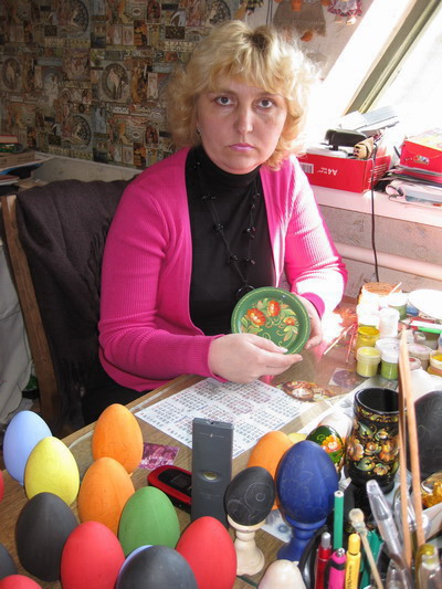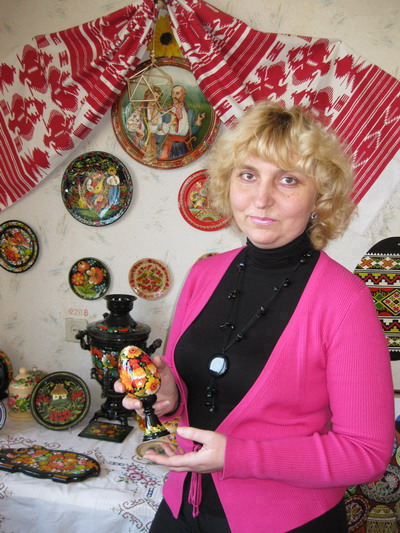 Когда попадаешь в эту студию, на душе становится радостнее и светлее от всей этой красоты! А она разместилась на полочках в виде красочных шкатулок, игрушек, дощечек, пасхальных яиц, развешана на стенах как расписные тарелки и картины, стоит на рабочих столах. Познакомилась я с руководителем кружка – Татьяной Петровной, мастером Петриковской росписи. Этой декоративной живописью она увлекается уже лет десять, а с детками занимается лишь второй год. Азы «Петриковки» она взяла у мастерицы Татьяны Дорошенко, много общалась с художниками-профессионалами на различных выставках, присматривалась к их работам, училась. Теперь делится своими навыками с черниговскими ребятами.
